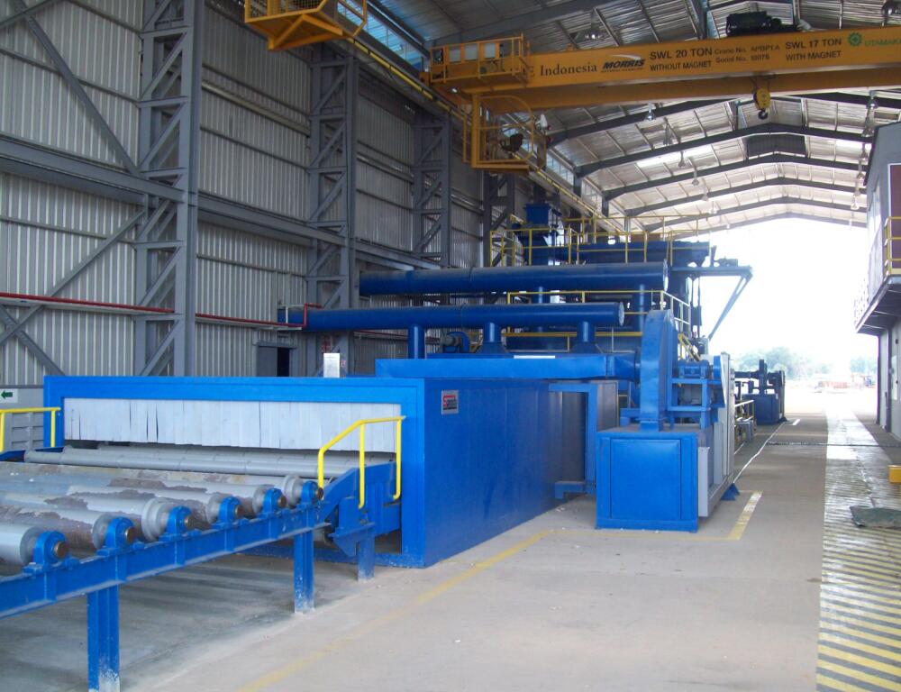鋼板預(yù)處理線工藝是指鋼板在加工前(即原材料狀態(tài))進行表面拋丸除銹并涂上一層保護底漆的加工工藝。鋼板經(jīng)過預(yù)處理可以提高機械產(chǎn)品和金屬構(gòu)件的抗腐蝕能力,提高鋼板的抗疲勞性能,延長其使用壽命;同時還可以優(yōu)化鋼板表面工藝制作狀態(tài),有利于數(shù)控切割機下料和精密落料。此外,由于加工前鋼板形狀比較規(guī)則,有利于機械除銹和自動化噴漆,因此采用鋼板預(yù)處理線可大大提高清理工作的效率,減輕清理工作的勞動強度和對環(huán)境的污染。