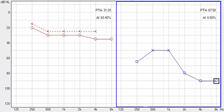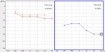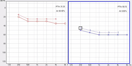 純音聽閾測試是聽力學所有測試項目中最基本的一項內容,包括氣導(AC)、骨導(BC)、最舒適閾(MCL)與不舒適閾(UCL)測試。測試結果能夠直接反映患者雙耳的聽力損失程度、性質與動態范圍,還能夠間接反映患者的患病位置、病因與助聽后效果。