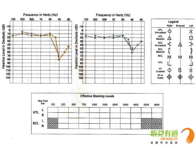 <span style="font-size:16px;"> 首先聽覺有道跟大家解釋一下純音測聽的定義以及臨床意義。純音測聽包括氣導聽閾測試(AC)和骨導聽閾測試(BC),以耳機及骨導振子給聲,反應受試者在安靜環(huán)境下能夠聽到的各個頻率的最小聲音的聽力級(氣導頻率范圍125-8000Hz,骨導250-4000Hz)。它是目前能準確反映聽敏度的主觀行為測試方法之一,在臨床上是最基本最重要的聽力檢查方法。</span></p><p><span style="font-size:16px;"><br /></span></p><p style="text-align: center;"><span style="font-size:16px;"><img src="/upfiles/201803010200415958.jpg" align="middle" alt="" /><br /></span></p><p style="text-align: center;"><span style="font-size:16px;"><br /></span></p><p><span style="font-size:16px;"> 先整體看一下聽力圖,它的橫坐標是純音的頻率,縱坐標表示的是聽力級(單位為db HL),從上往下看數(shù)字是變大的。0表示聽力零級,簡單地說就是科研人員測了很多聽力正常男女的聽力,以他們能聽到的最小聲音作為聽力零級。所以如果你的聽力是正常的話,聽力圖上的閾值曲線應該在零附近浮動,如果你聽力超常,那就在0以上也就是為負值了。如果你聽力下降,那線就往下走,越往下就說明聽力損失得越多。從生活常識上理解,所謂聽閾聽閾,閾值越低表示你能聽到越小的聲音,聽力就越好,閾值越高,聽力越差。</span></p><p><span style="font-size:16px;"> 接著說一下聽力圖上的圈圈叉叉代表的意思。叉叉表示左耳的氣導聽閾,圈圈表示右耳氣導,開口向左的尖括號表示左耳骨導,開口向右的表示右耳骨導。旁邊的masked表示加掩蔽之后的聽力。</span></p><p><span style="font-size:16px;"> 為什么要加掩蔽呢?舉個例子:你右耳聽力比左耳好,當你左耳給聲強度很大,會出現(xiàn)你左耳其實沒聽見但右耳偷聽到了的情況,這時你就會反應,但是這時你的反應能代表左耳的聽閾嗎?肯定比你實際聽閾要好,所以測聽人員會在你右耳加噪聲,不讓你右耳偷聽左耳的聲音,這樣測出來的左耳聽力稱掩蔽之后的聽閾。左耳掩蔽之后的氣導用小正方形來表示。同理,右耳掩蔽用小三角形表示。骨導也需要掩蔽。左耳掩蔽后骨導用向左的方括號表示,右耳用向右的方括號表示。</span></p><p><span style="font-size:16px;"> 最后我們該如何分析聽力圖。簡單地說,氣導的傳聲路徑包括外中內耳以及神經(jīng)部分,骨導只包括內耳和神經(jīng)部分,因此出現(xiàn)骨氣導差則表明聽覺通路上有外中耳病變。考慮到各種誤差因素,一般認為骨氣導相差10db HL屬于正常范圍。根據(jù)骨氣導的關系可以將聽力損失分為傳導性聽力損失、感音神經(jīng)性聽力損失以及混合性聽力損失。骨氣導差大于10,且骨導在正常范圍為傳導性聽損;骨氣導一致且都在正常范圍以外為感音神經(jīng)性聽損;骨氣導差大于10,骨導在正常范圍之外為混合性聽損。</span></p><p><span style="font-size:16px;"> 當然,如果想進一步定位聽力診斷結果,還需要結合其他的一些測試如聲導抗、ABR、耳蝸電圖、耳聲發(fā)射、40Hz、影像學檢查等。</span></p><p><span style="font-size:16px;"> 更多詳情請登錄www.chisha.net.cn。</span></p>" />