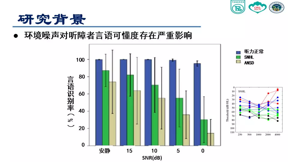 本項課題主要是研究使用無線麥克風系統對聽障患者在噪聲條件下和遠距離環境下對言語識別能力改善的效果。