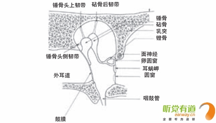 <span style="font-size:16px;"> 中耳結構包括鼓室、咽鼓管、鼓竇和乳突腔四部分。鼓室內有聽骨、肌肉、韌帶和神經。中耳是換能器,換能是將一種能量形式轉換成另一種能量形式,中耳通過鼓膜和聽骨鏈將聲能轉換為機械能,再由鐙骨底板將機械能轉換為內耳的液態能。</span></p><p><span style="font-size:16px;"> 鼓膜是中耳和外耳的分界,呈橢圓形,中間稍向內凹陷,色灰白,較透明,與耳道底約呈30°角。鼓膜寬約8mm,高約9mm,厚0.1mm,質地韌,其構造分三層:外層是皮膚層,中層由淺層的放射狀和深層的環狀纖維組成,它們使得鼓膜能承受一定的氣壓和水壓并抗感染,內層為粘膜層,與鼓室粘膜相連續。聲音的振動,即聲能,通過耳郭和耳道共振的加強,引起鼓膜隨之振動,鼓膜與中耳的錘骨相連,在正常耳,錘骨懸掛在自鼓膜頂端至下2/3處。錘骨柄的尖端將鼓膜頂向中耳,形成錐形鼓膜的頂,稱作臍。自臍向前下達鼓膜邊緣有一個三角形的反光區,名光錐,是外來光線被鼓膜的凹面集中反射而成。鼓膜下4/5為緊張部,上1/5由于缺乏纖維層而較松馳,稱為松弛部。鼓膜可分為前上、前下、后上、后下四個象限。兒童的鼓膜薄而有彈性,年齡越大,鼓膜越厚且越僵硬。鼓環將鼓膜固定在某一位置,使其成為在外耳和中耳之間的一層防水防氣的屏障。</span></p><center><span style="font-size:16px;"><img alt="" src="/upfiles/201810080137189845.png" width="440" height="250" /></span></center><p></p><p><span style="font-size:16px;"> 中耳鼓室</span></p><center><span style="font-size:16px;"><img alt="" src="/upfiles/201810080137242362.png" width="440" height="250" /></span></center><p></p><p><span style="font-size:16px;"> 正常鼓膜像(左)</span></p><p><span style="font-size:16px;"> 在中耳腔內的聽骨是人體最小的骨頭,分別叫作錘骨、砧骨和鐙骨。這些聽骨由韌帶連接并懸掛起來形成了聽骨鏈。錘骨柄附在鼓膜上,錘骨頭與砧骨頭形成錘砧關節,砧骨底與鐙骨頭形成砧鐙關節,鐙骨底板由環狀韌帶固定在卵圓窗上。聽骨鏈利用杠桿原理使來自鼓膜的機械能放大,傳遞到卵圓窗。</span></p><center><span style="font-size:16px;"><img alt="" src="/upfiles/201810080137303051.png" width="440" height="250" /></span></center><p></p><p><span style="font-size:16px;"> 聽骨鏈</span></p><p><span style="font-size:16px;"> 咽鼓管是中耳通氣引流的唯一途徑,也是中耳感染的主要途徑。它的一端開口在較高的中耳鼓室腔,另一端開口在較低的鼻咽部,通過咽鼓管在鼻咽部的開口,空氣可從外界直接進入中耳腔。咽鼓管平時處于關閉狀態,能較好的防止細菌感染,只有在咳嗽、擤鼻涕、打哈欠或吞咽時,咽鼓管才開放。當咽鼓管開放時,根據鼓膜外側的壓力情況,空氣或者從中耳流向外界,或者從外界流向中耳,使中耳壓力得以平衡。</span></p><p><span style="font-size:16px;"> 更多詳情請登錄www.chisha.net.cn</span></p>" />