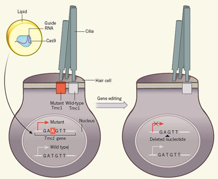 Chen和Liu團隊啟用的是熱門的CRISPR–Cas基因編輯技術。研究團隊將含有Cas9和RNA的脂滴注入新生TMC1貝多芬小鼠的內耳,這種脂滴能和細胞隨后融合。基因編輯后突變基因中腺嘌呤核苷酸A被敲除,從而使該基因失活。但同時保留了野生型基因,保證正常聽力功能實現。