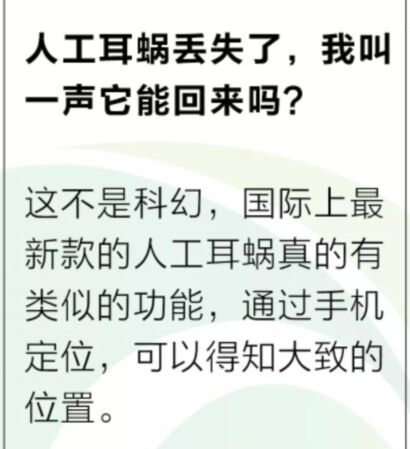 2019年4月10日這是一個新型的欄目<br /> 一本正經(jīng)地奇思妙想<br /> 內(nèi)容全靠一張圖<br /> 言語僅僅三兩句<br /> 大家隨便看看就行了<br /> 可一定得往心里去啊<br /><br /></span><div style="text-align: center;"><img src="/upfiles/20190410093258759.jpg" alt="" /></div> 嚴(yán)肅點:幾乎每個月,都有人工耳蝸丟失的事件發(fā)生,每一次都會成為該地方新聞的焦點。<br /> 無論我們多么小心,不經(jīng)意間的疏忽總會造成大麻煩。對于遺失耳蝸的家庭來說,一方面要承擔(dān)一筆不少的購機費用,另一方面會有一段時間的“聽力真空期”,我們不禁感嘆,要是耳蝸能自己報告位置就好了。<br /> 實際上這并非空想,國際某品牌人工耳蝸的最新設(shè)備已經(jīng)可以實現(xiàn)遺失位置定位,通過手機,我們可以找到處理器所在的大致位置(如果你有興趣,可以留言交流)。<br /> 5G時代,萬物互聯(lián),遺失定位也是未來人工耳蝸產(chǎn)品設(shè)計的趨勢之一,未來小伙伴們就可以體驗這種技術(shù)啦。<br /> 相關(guān)推薦閱讀:<a href="http://www.chisha.net.cn/listDetail.aspx?id=102609" target="_blank"><strong><span style="color:#3333ff;">保如果世界上沒有聽力設(shè)備:助聽器和耳蝸。</span></strong></a><br /><br /><br /> 聽覺有道助聽器價格:http://www.chisha.net.cn/products.html<br /><br /><br /> 發(fā)布于2019年4月10日 星期三<br /> 上午9:33分" />