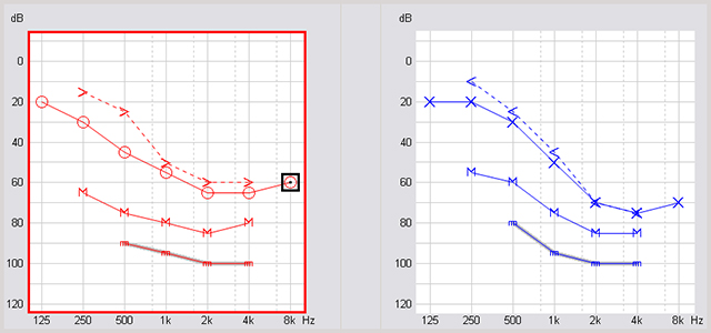 “為什么有時助聽器調了N次,弱聽人士就是不滿意呢?”</p><p> 這類案例常見于:聽覺動態范圍十分窄的,言語識別率極差的,雙耳不對稱性聽力損失,波動性聽力損失,陡降型聽力損失,上升型感音神經性聽力損失......</p><p> </p><center><img alt="" src="/upfiles/201904220157244106.png" width="590" height="194" /></center><p></p><p> 上期介紹了調N次都不滿意的原因,今天,將介紹解決方法。 在碰到這類復雜案例時,驗配師應該怎么做,才能最大化地減少誤差,為弱聽人士實現更佳的助聽效果呢?</p><p> 根據多年的臨床聽力學經驗,以及國內外的相關驗配經驗,匯總了處理復雜案例的通用驗配技巧。</p><p> 驗配技巧主要從聽力評估、選擇助聽器和調試助聽器這三方面進行詳細介紹,總共有8大驗配技巧,且聽一一道來。</p><p> 1. 聽力評估時:多角度評估聽力損失情況</p><p> </p><center><img alt="" src="/upfiles/20190422015730551.png" width="440" height="250" /></center><p></p><p> 聽力圖往往是聽力損失診斷的金標準,但實際上,聽力圖上顯示的氣、骨導閾值和不適閾只是聽覺系統某一方面的情況,而并不能反映聽覺系統完整的狀態。例如,高頻死區。</p><p> 對于有高頻死區的弱聽人士來說,從聽力圖上雖能看到高頻的聽閾和不適閾,但實際上,殘余聽力的“質量”卻是很差的,大腦沒辦法對傳進來的高頻死區信息進行編碼,最終的結果就是言語辨別能力差,聽不清楚。</p><p> 所以,聽力損失應該由兩部分組成。</p><p> 一部分是可聽度,這個可根據純音測聽的聽力圖來判斷;另一部分是畸變,而這個是需要通過言語測試,尤其是噪音下的言語測試來測定。也就是說,殘余聽力的質量到底如何是需要通過言語測試來判斷。</p><p> 所以,驗配師需要從純音聽力圖之外的多方面聽力評估,來了解弱聽人士的真實情況,這對助聽器的驗配很重要。</p><p> 2. 選擇助聽器時:使用多通道非線性壓縮技術</p><p> </p><center><img alt="" src="/upfiles/201904220157367171.png" width="440" height="250" /></center><p></p><p> 我們知道,感音神經性聽力損失的動態范圍普遍較窄,常有“小聲聽不到,大聲又覺吵”的重振現象。對于這類弱聽人士,可以使用多通道非線性壓縮技術。</p><p> 近三十年來,多通道非線性助聽器的研發一直致力于幫助弱聽人士在不同聆聽環境下能聽好,使用壓縮技術把完整的言語輸入信號“放入”弱聽人士變窄后的聽覺動態范圍。</p><p> 多通道非線性壓縮技術的目的是讓一切聲音都合適。</p><p> 所以,對于復雜案例,大多為非平坦、不規則的聽力圖形狀,建議使用多通道非線性壓縮技術對不同頻段進行細分處理,讓弱聽人士在其聽覺動態范圍內盡可能聽到環境中不同頻率不同強度的聲音。</p><p> 3. 選擇助聽器時:選擇頻響范圍較寬的助聽器</p><p> </p><center><img alt="" src="/upfiles/201904220157428948.png" width="440" height="250" /></center><p></p><p> 助聽器發展的重點之一是擴展頻響范圍。過去助聽器的高頻帶寬可能只能達到4kHz,但是現在的助聽器可以達到更高的帶寬,有些甚至可以接近10kHz或12kHz,相信以后助聽器的高頻帶寬可以更大。</p><p> 畢竟,助聽器可以拾取越寬頻響范圍的聲音,就有可能讓弱聽人士聽到越多的聲音信息。</p><p> 所以,與標準案例相比,在復雜案例的助聽器功能選擇時,可以選擇頻響范圍更寬的助聽器,給弱聽人士“還原”更多的聲音信息。</p><p> 當然,對于存在高頻死區的弱聽人士來說,聽覺系統不能編碼這些高頻帶寬的信息,反而會帶來失真和不適,所以這類弱聽人士的助聽器調試需要適當控制高頻范圍。</p><p> 4. 選擇助聽器時:移頻可能是個不錯的選擇</p><p> </p><center><img alt="" src="/upfiles/201904220157483059.png" width="440" height="250" /></center><p></p><p> 移頻,簡單的說就是將無法補償的高頻(如重度或極重度聽損)“移”到中頻去補償,這是改善高頻可聽度的一種方法。</p><p> 不過,如果有些弱聽人士沒辦法利用部分高頻信息(即高頻死區),那么移頻就得相應做調整。</p><p> 此時的移頻可能不是簡單地根據高頻的聽閾進行移頻補償,更多的時候,我們可以利用移頻將高頻死區部分“移除”到較低頻率,以改善這類弱聽人士對高頻言語的理解。</p><p> 如何知道哪些高頻是死區,可以通過TENS測試進行判斷。</p><p> 移頻是一個不錯的選擇,但它同樣不是萬能的,需要根據具體聽力情況具體分析,否則很有可能適得其反,造成額外的失真、不適。</p><p> 5. 助聽器調試時:輸入完整、準確的純音測聽數據</p><p> </p><center><img alt="" src="/upfiles/20190422015753726.png" width="640" height="300" /></center><p></p><p> 正如上一期文章給我們的啟示之一,要想盡可能得到準確的增益補償,完整、準確的純音測聽數據至關重要,這點在處理復雜案例時,更是基礎的基礎!</p><p> 在助聽器調試時,我們通常都會讓驗配處方公式幫我們快速、較準確地計算出各類驗配參數,如小聲、中聲、大聲增益。</p><p> 而處方公式是根據純音測聽數據來進行運算的,不同的處方公式所需的數據略有不同。 有些只需氣導聽閾,有些需要氣導和骨導聽閾,有些則在氣、骨導聽雨之外,還需要不適閾和舒適閾。</p><p> 如果我們只輸入氣導聽閾,對于需要骨導聽閾的情況,則只能由處方公式進行默認設置,例如把未輸入骨導聽閾的聽力損失都估算為感音神經性聽力損失。</p><p> 這對于常見的感音神經性聽力損失來說,可能影響不大;但對于傳導性聽力損失來說,可想而