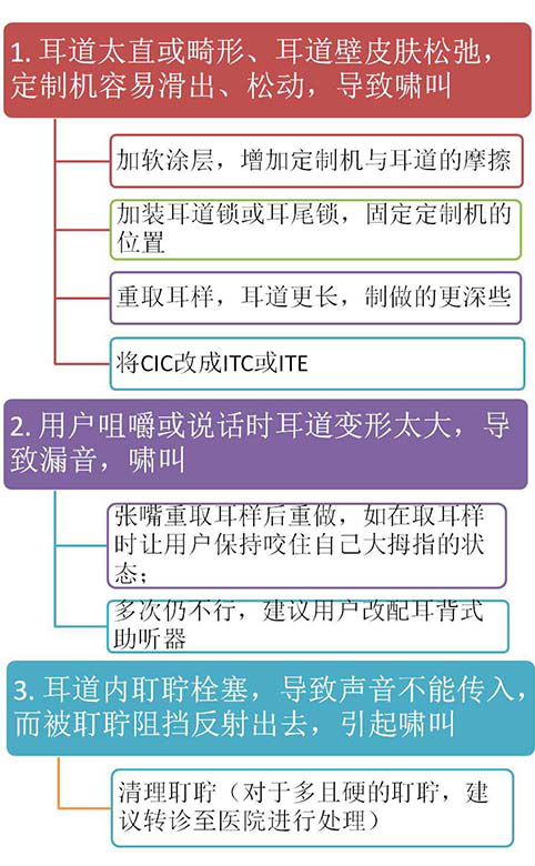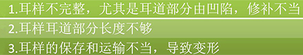 助聽器的嘯叫一直是困擾用戶和驗(yàn)配師的主要問題之一,其中定制機(jī)的嘯叫問題尤其突出。</p><p> 定制機(jī)是根據(jù)病人的聽力狀況和耳道形狀定制的,每一臺(tái)的制作都是獨(dú)一無二的,因此出現(xiàn)嘯叫的原因也比標(biāo)準(zhǔn)制作過程的耳背式助聽器復(fù)雜得多,有些定制機(jī)甚至多次重做仍然不能排除嘯叫。</p><p> 但無論如何只要我們客觀、理智地對(duì)待嘯叫問題,找出癥結(jié)之所在,對(duì)癥下藥,那么減少甚至避免嘯叫的也并非難事。</p><p> 什么是嘯叫?</p><p> 所謂嘯叫就是助聽器發(fā)出刺耳的連續(xù)尖叫聲,術(shù)語上我們稱之為聲反饋,它可能是聲音反饋或電路上的正反饋。</p><p> </p><center><img alt="" src="/upfiles/201905070200484006.png" width="440" height="250" /></center><p></p><p> 內(nèi)部嘯叫和外部嘯叫</p><p> 嘯叫分內(nèi)部嘯叫和外部嘯叫兩種。外部嘯叫主要是定制機(jī)外殼或耳背機(jī)耳模與耳道不密封引起的,而其它原因引起的嘯叫可稱為內(nèi)部嘯叫。</p><p> </p><center><img alt="" src="/upfiles/201905070200528641.png" width="440" height="250" /></center><p></p><p> 區(qū)分內(nèi)部嘯叫和外部嘯叫</p><p> 區(qū)分內(nèi)部和外部嘯叫時(shí)必須用聽筒,驗(yàn)配師用聽筒連接到用戶反映有嘯叫的助聽器的出聲孔,可用橡皮泥密封接口和通氣孔,不使聲音泄漏出來,然后從聽筒內(nèi)聽助聽器的輸出聲,若仍有嘯叫則說明助聽器有內(nèi)部嘯叫,否則說明助聽器只有外部嘯叫。</p><p> 內(nèi)部嘯叫的原因和排除</p><p> 內(nèi)部嘯叫的主要原因有:</p><p> </p><center><img alt="" src="/upfiles/20190507020058626.png" width="440" height="250" /></center><p></p><p> 為了防止助聽器出現(xiàn)內(nèi)部嘯叫,除了助聽器廠家對(duì)產(chǎn)品制作和檢驗(yàn)把好關(guān),對(duì)于驗(yàn)配師和用戶來說,需要特別注意兩點(diǎn):</p><p> </p><center><img alt="" src="/upfiles/201905070201041323.png" width="440" height="100" /></center><p></p><p> 外部嘯叫的原因和排除</p><p> 絕大部分用戶抱怨的定制機(jī)嘯叫是指外部嘯叫,外部嘯叫的原因和處理方法非常復(fù)雜,從定制機(jī)的整個(gè)驗(yàn)配過程來看,我們可以將這些根原歸納到下面四大類:</p><p> 1.耳道</p><p> 耳道的客觀情況是產(chǎn)生嘯叫的主要原因,其可能引起嘯叫的原因及解決方法如下:</p><p> </p><center><img alt="" src="/upfiles/201905070201091323.png" width="482" height="780" /></center><p></p><p> 2.耳樣(印模)</p><p> 耳樣是定制機(jī)外殼制作的原型,耳樣的好壞直接影響到外殼完成后的密封性和舒適度,病人的聽力損失越重,對(duì)耳樣的要求也越高。在耳樣這一環(huán)節(jié)的如下情況將導(dǎo)致定制機(jī)嘯叫:</p><p> </p><center><img alt="" src="/upfiles/201905070201157387.png" width="440" height="80" /></center><p></p><p> 取耳樣是驗(yàn)配師的基本功,必須在充分檢查耳道基礎(chǔ)上,膽大心細(xì)地取到合格的耳樣。</p><p> 3.選配和調(diào)試</p><p> </p><center><img alt="" src="/upfiles/201905070201216863.png" width="440" height="250" /></center><p></p><p> 選配最重要的就是做好外形和功率的平衡,不要為拉定單而勉強(qiáng)選配,如果用戶需要加大音量至幾乎滿檔才能使用,就容易出現(xiàn)嘯叫。</p><p> 助聽器增益設(shè)置(通過音量電位器或驗(yàn)配軟件設(shè)置)的理想位置應(yīng)該是在滿檔增益的二分之一到三分之二之間。</p><p> </p><center><img alt="" src="/upfiles/201905070201277561.png" width="440" height="250" /></center><p></p><p> 任何機(jī)型都有其選配范圍,如果超出此選配范圍,要讓助聽器始終在滿負(fù)荷下工作,即使沒有嘯叫,助聽器的失真、噪音等也會(huì)增加很多。</p><p> 因此選配合適的機(jī)型、線路和矩陣比重做外殼更合理、有效。</p><p> </p><center><img alt="" src="/upfiles/201905070201336863.png" width="440" height="250" /></center><p></p><p> 需要特別注意的是:價(jià)格單上的參考驗(yàn)配范圍是指中高頻的值,但低頻一般會(huì)低20dB 左右,所以僅僅平均增益小于參考驗(yàn)配范圍并不能保證每個(gè)頻率點(diǎn)都在驗(yàn)配范圍內(nèi)。</p><p> 加通氣孔是讓病人配戴更舒適的方法之一,但有時(shí)它也是產(chǎn)生嘯叫的禍?zhǔn)祝藭r(shí)減小甚至于堵塞通氣孔往往能立竿見影。堵塞氣孔可以用棉花或印模膏。</p><p> 對(duì)于一些中高檔機(jī)型帶反饋抑制功能的線路,可以設(shè)置反饋抑制的力度更大,一些輕微的嘯叫就能立刻消除。</p><p> </p><center><img alt="" src="/upfiles/201905070201384912.png" width="440" height="120" /></center><p></p><p> 4.制作</p><p> 關(guān)于定制機(jī)制作中避免外部嘯叫主要是助聽器廠家工程師需要嚴(yán)格把關(guān),如果僅僅是定制機(jī)和耳道有輕微的不密封,可以加涂光亮漆或軟涂層處理,現(xiàn)場的維修中心技術(shù)員可以提供這一快速服務(wù)。</p><p> 需要重做時(shí),必須由經(jīng)驗(yàn)豐富的制作人員綜合驗(yàn)配師提供的信息和上次制作的記錄作出針對(duì)性措施。例如增加膨脹系數(shù)、加厚密封圈、加深耳道、調(diào)整出聲孔方向等。</p><p> 總之,定制機(jī)產(chǎn)生嘯叫的原因是多種多樣的,從取耳樣、選線路與矩陣直至制作,最后到調(diào)試和配戴,每一個(gè)環(huán)節(jié)處理不好都有可能產(chǎn)生嘯叫,只有抓好每個(gè)細(xì)節(jié),才能最大可能地滿足病人,提高選配的成功率。</p><p> 更
