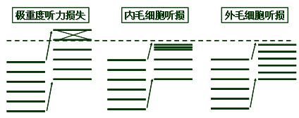 見下圖.虛線代表患者的最大不適閾,左邊的格子代表輸入的正常聲音強度,右邊三種疏密不同的線 條表示,經過助聽器放大后,不同壓縮線路聲音處理結果。可以見到,極重度聽力損失過去使用線性發達,峰值信息被削掉部分;內毛細胞使用的是輸出式壓縮,又稱限幅壓縮線路,近高峰值時,強度壓縮比例增加,顯得有些“擁擠”,而外毛細胞使用的是輸入壓縮線路,可以見到,所有的信息是“均衡處理”,納入患者的動態范圍,因此,放大效果較好。