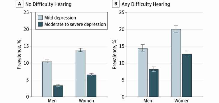 左邊為沒有聽力損失的抑郁概率,右邊為有聽力損失的抑郁概率。統計來源:《美國醫學雜志》