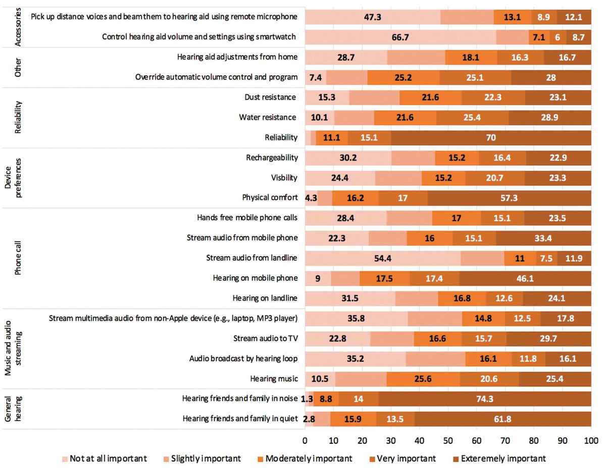 <span style="white-space:pre"> </span>助聽(tīng)器用戶(hù)最關(guān)注的助聽(tīng)器問(wèn)題是什么呢?<br /><br /></span><p><span style="font-size:16px;"> 近兩年來(lái),美國(guó)HearingTracker網(wǎng)站征集了上萬(wàn)名助聽(tīng)器使用者的意見(jiàn),得到較為客觀(guān)的反饋數(shù)據(jù)。</span></p><p><span style="font-size:16px;"><br /></span></p><p style="text-align: center;"><span style="font-size:16px;"><img src="/upfiles/202109180411392952.jpg" width="640" alt="" /><br /></span></p><p style="text-align: center;"><span style="font-size:16px;"><br /></span></p><span style="font-size:16px;"> <strong>助聽(tīng)器用戶(hù)最在意的:</strong><br /><br /> 噪聲環(huán)境下的清晰度<br /><br /> 設(shè)備可靠性<br /><br /> 安靜環(huán)境下的清晰度<br /><br /> 佩戴舒適度<br /><br /> <strong>助聽(tīng)器用戶(hù)最不在意的:</strong><br /><br /> 智能手表控制<br /><br /> 固定電話(huà)流<br /><br /> 接收遠(yuǎn)處聲音的拓展性<br /></span><p><span style="font-size:16px;"> 聽(tīng)覺(jué)環(huán)路</span></p><p><span style="font-size:16px;"><br /></span></p><p style="text-align: center;"><span style="font-size:16px;"><img src="/upfiles/202109180412136016.jpg" width="640" alt="" /><br /></span></p><div style="text-align: center;"><span style="font-size:16px;"> Data from HearingTracker's consumer survey,as analyzed by Vinaya Manchaiah and Erin Picou.</span></div><div style="text-align: center;"><span style="font-size:16px;"><br /></span></div><span style="font-size:16px;"><br /> 這個(gè)調(diào)查結(jié)果,也許并不出人意料。<br /><br /> 助聽(tīng)器用戶(hù)們最關(guān)注的是在噪聲環(huán)境下的清晰度,其次是設(shè)備可靠性、安靜環(huán)境下的清晰度和佩戴舒適度。<br /><br /> 盡管近15%的人認(rèn)為通過(guò)智能手表來(lái)控制助聽(tīng)器音量的功能是非常/極為重要的,但66.7%的人覺(jué)得沒(méi)什么必要。<br /><br /></span><p><span style="font-size:16px;"> 51.3%的用戶(hù)希望能夠在家調(diào)試自己的助聽(tīng)器,而不必耗費(fèi)時(shí)間和精力到線(xiàn)下的醫(yī)院或驗(yàn)配中心。</span></p><p><span style="font-size:16px;"><br /></span></p><p style="text-align: center;"><span style="font-size:16px;"><img src="/upfiles/202109180412599513.jpg" width="640" alt="" /><br /></span></p><p style="text-align: center;"><span style="font-size:16px;"><br /></span></p><span style="font-size:16px;"> 超過(guò)90%的助聽(tīng)器用戶(hù)認(rèn)為,戴上助聽(tīng)器,無(wú)論是在噪聲環(huán)境還是安靜環(huán)境下,是否能聽(tīng)清親友的聲音,都非常重要,尤其在噪聲環(huán)境。<br /><br /> 對(duì)于近幾年來(lái)火熱的無(wú)線(xiàn)連接功能,調(diào)查發(fā)現(xiàn):當(dāng)用戶(hù)熟悉使用這個(gè)功能后,會(huì)成為它的忠實(shí)粉絲。<br /><br /> 大多數(shù)用戶(hù)希望助聽(tīng)器能夠支持手機(jī)通話(huà),對(duì)支持使用固定電話(huà)的需求較少。<br /><br /> 70%以上的用戶(hù)希望助聽(tīng)器能夠支持聽(tīng)音樂(lè),約62%的用戶(hù)希望通過(guò)音頻直傳連接電視。<br /><br /></span><p><span style="font-size:16px;"> 67%的用戶(hù)認(rèn)為助聽(tīng)器的防塵性是重要的,75.9%的用戶(hù)認(rèn)為助聽(tīng)器的防水性是重要的。</span></p><p><span style="font-size:16px;"><br /></span></p><p style="text-align: center;"><span style="font-size:16px;"><img src="/upfiles/202109180413225493.jpg" width="640" alt="" /><br /></span></p><p style="text-align: center;"><span style="font-size:16px;"><br /></span></p><span style="font-size:16px;"> 助聽(tīng)器的可靠性(安全耐用)始終是用戶(hù)關(guān)心的重要話(huà)題,關(guān)注程度遠(yuǎn)超隱蔽性、可充電性。<br /><br /> 當(dāng)今世界助聽(tīng)器技術(shù)發(fā)展,勢(shì)必要為所有的助聽(tīng)器用戶(hù)著想,所以更側(cè)重于上面用戶(hù)關(guān)注度排在前列的技術(shù)發(fā)展鉆研。但這對(duì)小部分人來(lái)說(shuō),并不是一件很酷的事。<br /><br /> 參考:HearingTracker網(wǎng)站,聽(tīng)力行業(yè)通訊<br /><br /> 調(diào)查結(jié)果可能會(huì)受地域與文化影響而有所差異,但有一定的參考價(jià)值</span>" />