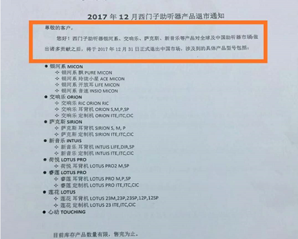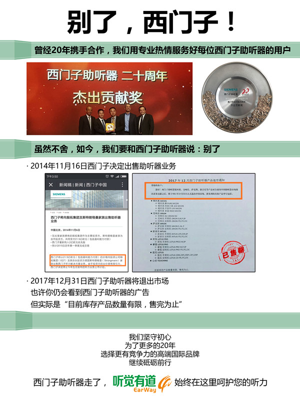 <p microsoft="" yahei="" ui="" simsun="" segoe="" tahoma="" helvetica="" sans-serif="" font-size:="" 14px="" text-align:="" center="" style="padding: 5px 0px; margin: 0px; color: rgb(51, 51, 51); font-family: "Microsoft YaHei UI", "Microsoft YaHei", SimSun, "Segoe UI", Tahoma, Helvetica, sans-serif; font-size: 16px; text-align: center;"><img src="http://www.chisha.net.cn/upfiles/201712110502357735.jpg" alt="" style="border: 0px;" /></p><p microsoft="" yahei="" ui="" simsun="" segoe="" tahoma="" helvetica="" sans-serif="" font-size:="" 14px="" text-align:="" center="" style="padding: 5px 0px; margin: 0px; color: rgb(51, 51, 51); font-family: "Microsoft YaHei UI", "Microsoft YaHei", SimSun, "Segoe UI", Tahoma, Helvetica, sans-serif; font-size: 16px; text-align: center;"><br /></p><p microsoft="" yahei="" ui="" simsun="" segoe="" tahoma="" helvetica="" sans-serif="" font-size:="" 14px="" text-align:="" center="" style="padding: 5px 0px; margin: 0px; color: rgb(51, 51, 51); font-family: "Microsoft YaHei UI", "Microsoft YaHei", SimSun, "Segoe UI", Tahoma, Helvetica, sans-serif; font-size: 16px; text-align: center;"><img src="http://www.chisha.net.cn/upfiles/201712201117438957.jpg" alt="" style="border: 0px;" /><br /></p><p microsoft="" yahei="" ui="" simsun="" segoe="" tahoma="" helvetica="" sans-serif="" font-size:="" 14px="" text-align:="" center="" style="padding: 5px 0px; margin: 0px; color: rgb(51, 51, 51); font-family: "Microsoft YaHei UI", "Microsoft YaHei", SimSun, "Segoe UI", Tahoma, Helvetica, sans-serif; font-size: 16px; text-align: center;"><br /></p><p microsoft="" yahei="" ui="" simsun="" segoe="" tahoma="" helvetica="" sans-serif="" font-size:="" 14px="" text-align:="" center="" style="padding: 5px 0px; margin: 0px; color: rgb(51, 51, 51); font-family: "Microsoft YaHei UI", "Microsoft YaHei", SimSun, "Segoe UI", Tahoma, Helvetica, sans-serif; font-size: 16px; text-align: center;">2014年11月16日西門子決定出售助聽器業務</p><p microsoft="" yahei="" ui="" simsun="" segoe="" tahoma="" helvetica="" sans-serif="" font-size:="" 14px="" text-align:="" center="" style="padding: 5px 0px; margin: 0px; color: rgb(51, 51, 51); font-family: "Microsoft YaHei UI", "Microsoft YaHei", SimSun, "Segoe UI", Tahoma, Helvetica, sans-serif; font-size: 16px; text-align: center;"> </p><center microsoft="" yahei="" ui="" simsun="" segoe="" tahoma="" helvetica="" sans-serif="" font-size:="" 14px="" style="color: rgb(51, 51, 51); font-family: "Microsoft YaHei UI", "Microsoft YaHei", SimSun, "Segoe UI", Tahoma, Helvetica, sans-serif; font-size: 16px;"><img src="http://www.chisha.net.cn/upfiles/20171211050740709.jpg" alt="" style="border: 0px;" /><br /></center><center microsoft="" yahei="" ui="" simsun="" segoe="" tahoma="" helvetica="" sans-serif="" font-size:="" 14px="" style="color: rgb(51, 51, 51); font-family: "Microsoft YaHei UI", "Microsoft YaHei", SimSun, "Segoe UI", Tahoma, Helvetica, sans-serif; font-size: 16px;"><br /></center><p microsoft="" yahei="" ui="" simsun="" segoe="" tahoma="" helvetica="" sans-serif="" font-size:="" 14px="" text-align:="" center="" style="padding: 5px 0px; margin: 0px; color: rgb(51, 51, 51); font-family: "Microsoft YaHei UI", "Microsoft YaHei", SimSun, "Segoe UI", Tahoma, Helvetica, sans-serif; font-size: 16px; text-align: center;">2017年12月31日西門子助聽器將正式退出中國市場</p><p microsoft="" yahei="" ui="" simsun="" segoe="" tahoma="" helvetica="" sans-serif="" font-size:="" 14px="" text-align:="" center="" style="padding: 5px 0px; margin: 0px; color: rgb(51, 51, 51); font-family: "Microsoft YaHei UI", "Microsoft YaHei", SimSun, "Segoe UI", Tahoma, Helvetica, sans-serif; font-size: 16px; text-align: center;"> </p><center microsoft="" yahei="" ui="" simsun="" segoe="" tahoma="" helvetica="" sans-serif="" font-size:="" 14px="" style="color: rgb(51, 51, 51); font-family: "Microsoft YaHei UI", "Microsoft YaHei", SimSun, "Segoe UI", Tahoma, Helvetica, sans-serif; font-size: 16px;"><img src="http://www.chisha.net.cn/upfiles/201712110508305244.png" alt="" style="border: 0px;" /><br /></center><center microsoft="" yahei="" ui="" simsun="" segoe="" tahoma="" helvetica="" sans-serif="" font-size:="" 14px="" style="color: rgb(51, 51, 51); font-family: "Microsoft YaHei UI", "Microsoft YaHei", SimSun, "Segoe UI", Tahoma, Helvetica, sans-serif; font-size: 16px;"><br /></center><p microsoft="" yahei="" ui="" simsun="" segoe="" tahoma="" helvetica="" sans-serif="" font-size:="" 14px="" text-align:="" center="" style="padding: 5px 0px; margin: 0px; color: rgb(51, 51, 51); font-family: "Microsoft YaHei UI", "Microsoft YaHei", SimSun, "Segoe UI", Tahoma, Helvetica, sans-serif; font-size: 16px; text-align: center;">銀河系、交響樂、薩克斯、新音樂、荷悅、睿蓮、蓮花、心動……</p><p microsoft="" yahei="" ui="" simsun="" segoe="" tahoma="" helvetica="" sans-serif="" font-size:="" 14px="" text-align:="" center="" style="padding: 5px 0px; margin: 0px; color: rgb(51, 51, 51); font-family: "Microsoft YaHei UI", "Microsoft YaHei", SimSun, "Segoe UI", Tahoma, Helvetica, sans-serif; font-size: 16px; text-align: center;">西門子助聽器系列產品悉數退市</p><p microsoft="" yahei="" ui="" simsun="" segoe="" tahoma="" helvetica="" sans-serif="" font-size:="" 14px="" text-align:="" center="" style="padding: 5px 0px; margin: 0px; color: rgb(51, 51, 51); font-family: "Microsoft YaHei UI", "Microsoft YaHei", SimSun, "Segoe UI", Tahoma, Helvetica, sans-serif; font-size: 16px; text-align: center;"> </p><center microsoft="" yahei="" ui="" simsun="" segoe="" tahoma="" helvetica="" sans-serif="" font-size:="" 14px="" style="color: rgb(51, 51, 51); font-family: "Microsoft YaHei UI", "Microsoft YaHei", SimSun, "Segoe UI", Tahoma, Helvetica, sans-serif; font-size: 16px;"><img src="http://www.chisha.net.cn/upfiles/201712110509096639.jpg" alt="" style="border: 0px;" /><br /></center><p microsoft="" yahei="" ui="" simsun="" segoe="" tahoma="" hel