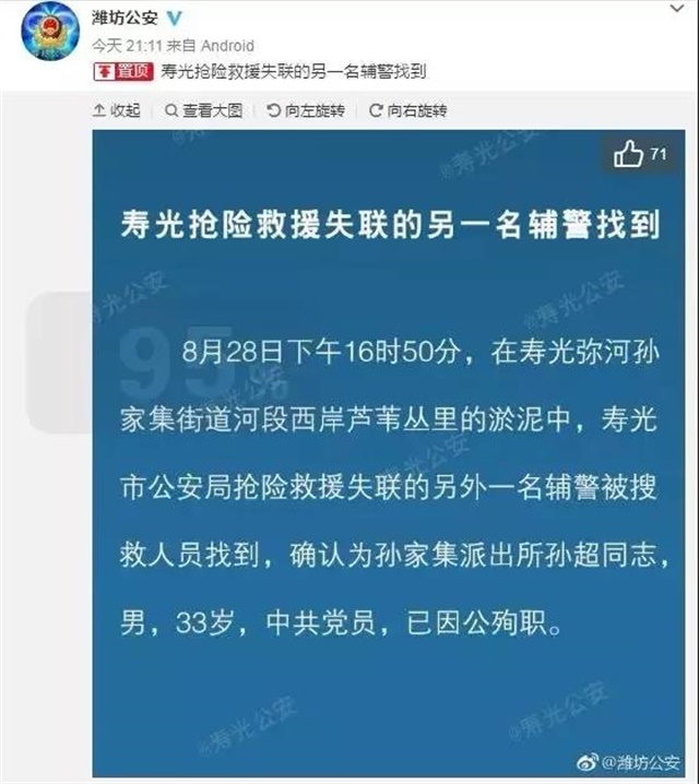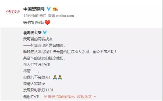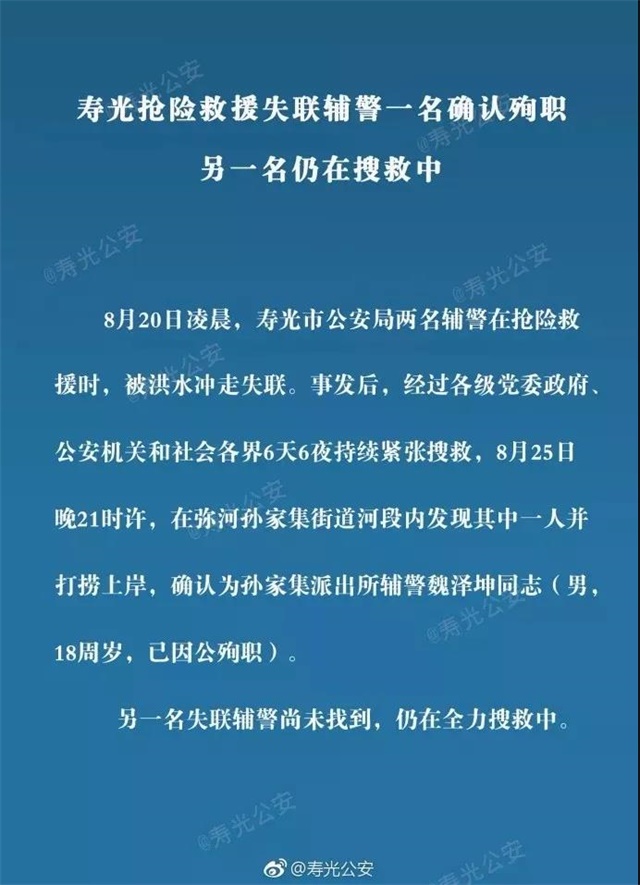 <span style="font-size: 16px;"> 2018年8月20日凌晨,壽光市兩名輔警在搶險(xiǎn)救援時(shí),被洪水沖走失聯(lián)。事發(fā)后,經(jīng)過(guò)連續(xù)幾天的緊張搜救,他們以我們最不愿意看到的方式歸來(lái)了。</span></p><p><span style="font-size: 16px;"> 8月25日晚21時(shí)許,在彌河孫家集街道河段內(nèi)發(fā)現(xiàn)一人,確認(rèn)為孫家集派出所輔警魏澤坤同志(男,18周歲,因公殉職)。</span></p><p><span style="font-size: 16px;"> 8月28日下午16時(shí),在彌河孫家集街道河段西岸發(fā)現(xiàn)另一名輔警,確認(rèn)為孫家集派出所孫超同志(男,33歲,因公殉職)。</span></p><p><span style="font-size: 16px;"> 他是家里的頂梁柱啊</span></p><p><span style="font-size: 16px;"> 33歲的孫超是家里的頂梁柱,他的愛(ài)人郭立華是聽(tīng)覺(jué)有道的店長(zhǎng)。</span></p><p><span style="font-size: 16px;"> 孫超有一子一女,大女兒才滿(mǎn)10歲,父母年近60,身體都不是很好。還有一個(gè)85歲的老奶奶,身體也不好,孫超失蹤時(shí),一家人一直都不敢告訴她消息。</span></p><p><span style="font-size: 16px;"> 18日早,因?yàn)橄掠?,孫超怕路不好走,還提前送郭店長(zhǎng)到門(mén)店上班,然后才回派出所。</span></p><p><span style="font-size: 16px;"> 事發(fā)前2小時(shí),他們夫妻互通了電話(huà)。孫超說(shuō),自己全身濕透了,水很大,11點(diǎn)之后,就沒(méi)有了音訊。</span></p><p><span style="font-size: 16px;"> 他們夫妻倆都是好員工,孫超還是共產(chǎn)黨員,他們沒(méi)有好好地拍過(guò)幾張全家福,甚至沒(méi)能抽空一家人好好玩一天。</span></p><p><span style="font-size: 16px;"> 孫超是個(gè)好老公,他一回家就看孩子,哄孩子睡覺(jué),一有空就給老婆孩子洗衣服。為了省錢(qián)養(yǎng)家,他連幾十塊錢(qián)的鞋子都舍不得買(mǎi),老婆給他買(mǎi)回來(lái)了,他還不舍得穿……</span></p><p><span style="font-size: 16px;"> 對(duì)于我們而言,郭店長(zhǎng)和孫超都像家人一樣,我們多么期盼他是平平安安地回來(lái)。</span></p><p><span style="font-size: 16px;"> 化作春泥更護(hù)花</span></p><p><span style="font-size: 16px;"> 兩位輔警失蹤的幾天,我們看到了人們對(duì)英雄的珍惜。</span></p><p><span style="font-size: 16px;"> 濰坊市調(diào)集了1000多名警力、700多名沿河鎮(zhèn)街干部群眾、11支專(zhuān)業(yè)救援隊(duì)、18艘沖鋒舟、20架無(wú)人機(jī)、10頭搜救犬等,全線(xiàn)展開(kāi)大范圍搜尋。</span></p><p><span style="font-size: 16px;"> 還有很多人民群眾,也自發(fā)參與了本次救援,總計(jì)6000多人,為了找到2個(gè)人,找了幾天幾夜,很多人都沒(méi)怎么好好睡覺(jué)。</span></p><p><span style="font-size: 16px;"> 他們最希望的,是把他們安全帶回來(lái)。反正無(wú)論如何,都要把他們找到。</span></p><p><center><img src="/upfiles/201808310437256664.jpg" alt="" /></center><center><br /></center><center> <img src="/upfiles/20180831043725120.jpg" alt="" /> </center><center><br /></center><center><img src="/upfiles/20180831043725884.jpg" alt="" /> </center><center><br /></center><center><img src="/upfiles/201808310437253890.jpg" alt="" /></center><center><br /></center><center> <img src="/upfiles/201808310437262486.jpg" alt="" /> </center><center><br /></center><center><img src="/upfiles/20180831043726269.jpg" alt="" /></center><center><br /></center><center> <img src="/upfiles/201808310437264172.jpg" alt="" /> </center><center><br /></center><center><img src="/upfiles/201808310437261506.jpg" alt="" /></center><center><br /></center><center> <img src="/upfiles/201808310437267495.jpg" alt="" /></center><center><br /></center><center> <img src="/upfiles/201808310437262138.jpg" alt="" /><span style="font-size: 16px;"> </span><span style="font-size: 16px;"> </span></center></p><p></p><p><span style="font-size: 16px;"> 而很多人,在各個(gè)地方關(guān)注著這一切。</span></p><p><span style="font-size: 16px;"> 他們可能身處中國(guó)的各個(gè)角落,平時(shí)有各自的愛(ài)好,從事著不同的職業(yè),跟我們一樣,他們也都為兩位輔警擔(dān)憂(yōu)過(guò),祈禱過(guò)。</span></p><p><center><span style="font-size: 16px;"> <img src="/upfiles/201808310438352320.jpg" alt="" /> </span></center><center><span style="font-size: 16px;"><br /></span></center><center><span style="font-size: 16px;"><img src="/upfiles/201808310438359206.jpg" alt="" /></span></center><center><span style="font-size: 16px;"><br /></span></center><center><span style="font-size: 16px;"> <img src="/upfiles/201808310438359231.jpg" alt="" /></span></center></p><p></p><p><span style="font-size: 16px;"> 令人惋惜和哀痛的是,我們沒(méi)能等到想要的結(jié)局。但我們深知,兩位輔警并沒(méi)有徹底消失,在這片他們生活過(guò)的土地上,每一個(gè)角落都存在著他們的身影。</span></p><p><span style="font-size: 16px;"> 愿英雄安息</span></p><p><span style="font-size: 16px;"> 唯物者不信鬼神的存在,但兩位輔警的精神定與日月同輝;風(fēng)雨飄搖盡顯英雄本色,被風(fēng)雨洗禮的人們會(huì)記住孫超、魏澤坤這兩個(gè)名字,因?yàn)樗麄兩淖詈笠豢?,始終代表著人民的名義。</span></p><p><span style="font-size: 16px;"> 兩位英雄,他們?yōu)榱藫岆U(xiǎn)救援,離開(kāi)了人世。</span></p><p><span style="font-size: 16px;"> 他們把最美好的青春歲月獻(xiàn)給了警營(yíng),留給了老百姓,卻還沒(méi)來(lái)得及跟自己的家人說(shuō)一聲再見(jiàn),多么令人哀痛和讓人崇敬!</span></p><p style="text-align: center;"><span style="font-size: 16px;"><img src="/upfiles/201
