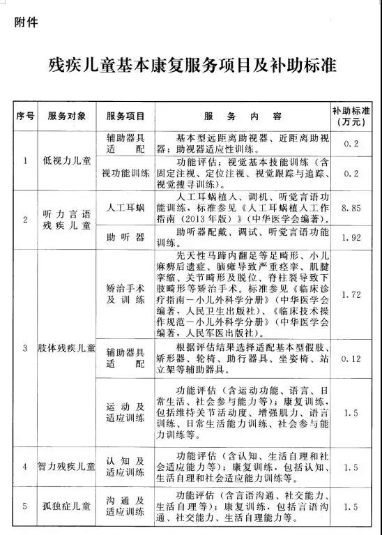 各盟行政公署、市人民政府,各旗縣人民政府,自治區各委、辦、廳、局,各大企業、事業單位:</p><p> 為全面貫徹落實黨的十九大關于發展殘疾人事業,加強殘疾康復服務的重要部署,保障殘疾兒童得到基本康復服務,根據《殘疾預防和殘疾人康復條例》《國務院關于建立殘疾兒童康復救助制度的意見》(國發〔2018〕20號)精神,結合自治區實際,現提出如下實施意見。</p><p> 一、總體要求</p><p> (一)指導思想</p><p> 以習近平新時代中國特色社會主義思想為指導,全面深入貫徹黨的十九大和十九屆二中、三中全會精神,認真落實黨中央、國務院決策部署,統籌推進“五位一體”總體布局和協調推進“四個全面”戰略布局,堅持以人民為中心的發展思想,牢固樹立新發展理念,按照兜底線、織密網、建機制的要求,提高民生保障水平,努力實現殘疾兒童“人人享有康復服務”,提高殘疾兒童健康水平,為全面建成小康社會,建設亮麗內蒙古,共圓偉大中國夢做出貢獻。</p><p> (二)基本原則</p><p> 堅持政府主導、守住底線。積極發揮各級人民政府“?;尽弊饔?,逐步推進殘疾兒童基本康復服務均等化。</p><p> 堅持制度銜接、應救盡救。加強與基本醫療、臨時救助等社會保障制度的有效銜接,確保救助及時。</p><p> 堅持盡力而為、量力而行。突出重點、完善機制、引導預期,著力滿足殘疾兒童基本康復服務需求。</p><p> 堅持規范有序、公正公開。建立科學便民的運行機制,提高服務質量,主動接受群眾和社會監督。</p><p> (三)總體目標</p><p> 到2020年,建立與全面建成小康社會目標相適應的殘疾兒童康復救助制度體系,形成黨委領導、政府主導、殘聯牽頭、部門配合、社會參與的殘疾兒童康復救助工作格局,基本實現殘疾兒童應救盡救。</p><p> 到2025年,殘疾兒童康復救助制度體系更加健全完善,殘疾兒童康復服務供給能力顯著增強,服務質量和保障水平明顯提高,殘疾兒童普遍享有基本康復服務,健康成長、全面發展權益得到有效保障。</p><p> 二、具體內容</p><p> (一)救助對象</p><p> 救助對象為符合救助條件的0-7歲視力、聽力、言語、肢體、智力等殘疾兒童和孤獨癥兒童。包括城鄉最低生活保障家庭的殘疾兒童;建檔立卡貧困戶家庭的殘疾兒童;兒童福利機構收留撫養的殘疾兒童;殘疾孤兒;納入特困人員供養范圍的殘疾兒童;其他經濟困難家庭的殘疾兒童。</p><p> 其他經濟困難家庭的具體認定辦法,由旗縣(市、區)人民政府制定。有條件的地區,可適當擴大殘疾兒童康復救助年齡范圍,也可放寬對殘疾兒童家庭經濟條件的限制。</p><p> (二)救助內容</p><p> 1.殘疾兒童康復救助基本服務內容,包括以減輕功能障礙、改善功能狀況、增強生活自理和社會參與能力為主要目的的手術、輔助器具配置和康復訓練等(見附件)。盟市、旗縣(市、區)人民政府可根據本地區實際增加殘疾兒童康復救助基本服務內容。其中,康復訓練救助時間原則上每年不超過10個月,各地區可根據本地區實際情況確定救助時間。</p><p> 2.有條件的盟市、旗縣(市、區)可開展殘疾兒童康復期間監護人陪護救助,根據本地區實際確定救助內容和標準。</p><p> 3.將殘疾兒童全部納入城鄉居民基本醫療保險保障范圍,對符合政策規定的殘疾兒童,參加城鄉居民基本醫療保險個人繳費部分,由政府給予補貼。</p><p> (三)救助標準</p><p> 1.視力、聽力言語、肢體、智力殘疾兒童和孤獨癥兒童救助參照國家和自治區現行標準執行(詳見附件)。</p><p> 2.盟市、旗縣(市、區)人民政府根據本地區財力狀況、保障對象數量、殘疾類別等,可適當提高殘疾兒童康復救助經費保障標準,包括殘疾兒童矯形器、輪椅、助行器等輔助器具救助標準,并建立動態調整機制。</p><p> (四)工作流程</p><p> 申請。殘疾兒童監護人向殘疾兒童戶籍所在地(居住證發放地)旗縣級殘聯組織提出申請。監護人也可委托他人、社會組織、社會救助經辦機構等代為申請。</p><p> 審核。對于城鄉最低生活保障家庭、建檔立卡貧困戶家庭的殘疾兒童和兒童福利機構收留撫養的殘疾兒童的救助申請,以及殘疾孤兒、納入特困人員供養范圍的殘疾兒童的救助申請,由旗縣級殘聯組織與民政、扶貧部門進行相關信息比對后作出決定;其他經濟困難家庭殘疾兒童救助申請的審核程序,由旗縣(市、區)人民政府規定。對符合條件的殘疾兒童在30個工作日內批準并列入康復救助計劃,對不符合條件的殘疾兒童向申請人說明理由。</p><p> 救助。經審核符合條件的,由殘疾兒童監護人自主選擇定點康復機構接受康復服務。必要時,由盟市以上殘聯組織和衛生健康部門指定的醫療、康復機構做進一步診斷、康復需求評估。定點康復機構由旗縣級以上殘聯組織會同衛生健康、教育、民政等部門按照公開擇優原則選擇確定。</p><p> 結算。在定點康復機構接受康復服務發生的費用,經旗縣級殘聯組織審核后,由同級財政部門與定點康復機構直接結算,結算周期由旗縣級殘聯組織商同級財政部門確定。經旗縣級殘聯組織審核同意在非定點康復機構接受康復服務發生的費用,由旗縣級殘聯組織商同級財政部門明確結算辦法。</p><p> (五)經費保障</p><p> 盟市、旗縣(市、區)人民政府要將殘疾兒童康復救助資金納入政府預算。2019年起,自治區在中央財政補助的基礎上,統籌現有的貧困殘疾兒童搶救性補助資金、自治區“