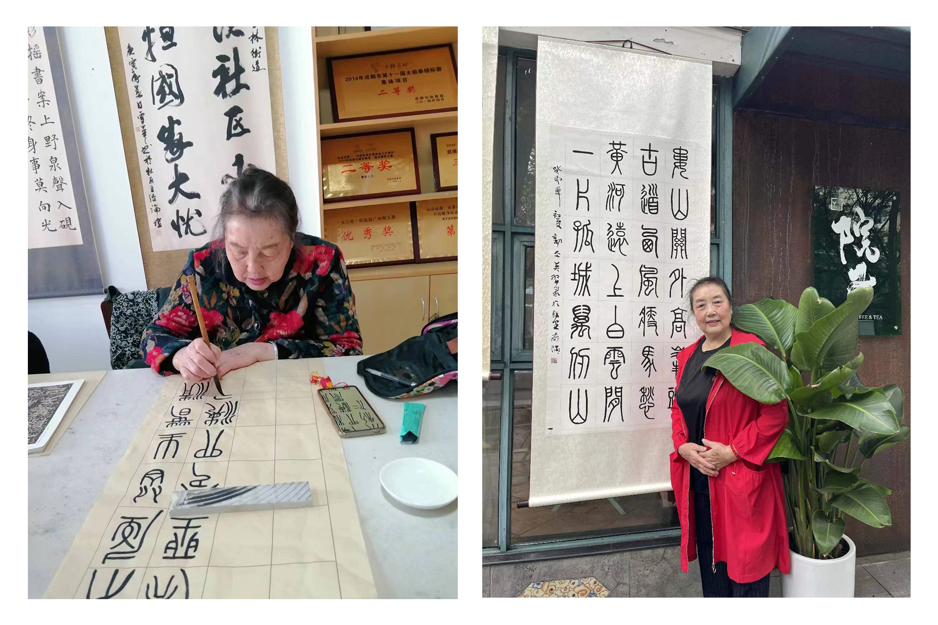 郭阿姨每天都要學習毛筆字、國畫、手工編制、窗花雕刻、彈奏鋼琴等。
