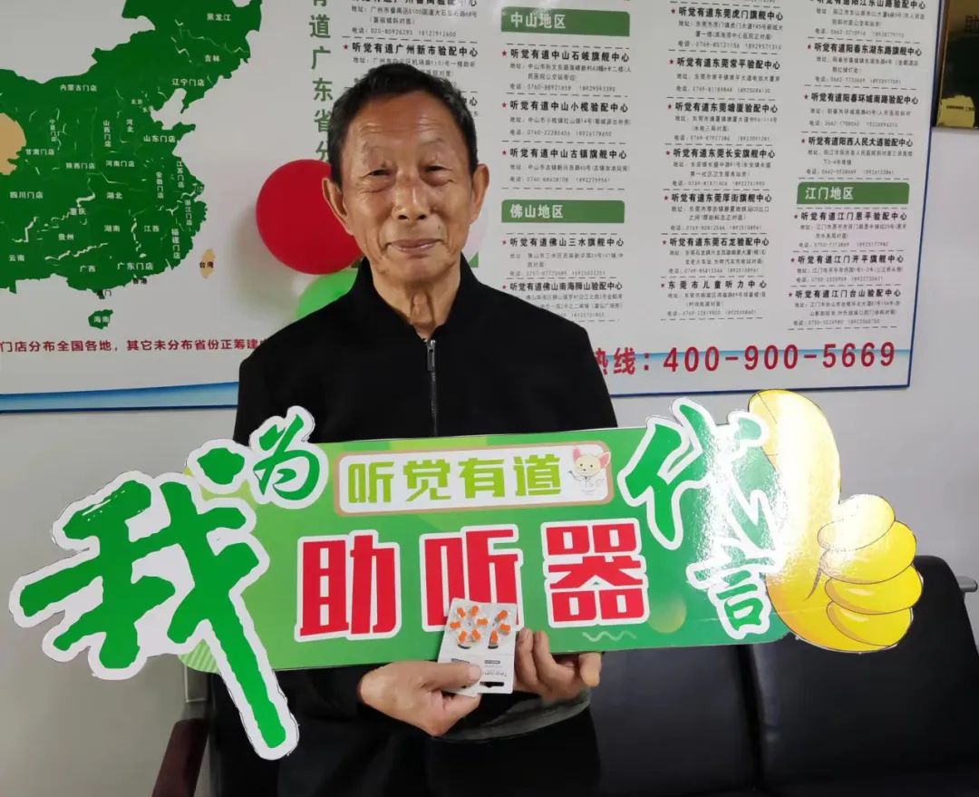 我們通知羅爺爺來取助聽器,試戴的效果很好,他很滿意,笑得像個小孩子一樣。